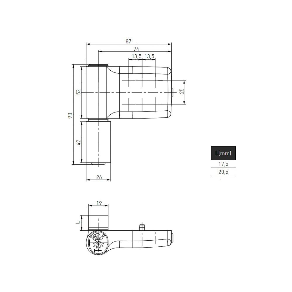 Kétrészes ajtópánt, extrudált alumínium test, acél tengely, 6 irányba állítható, jobbos és